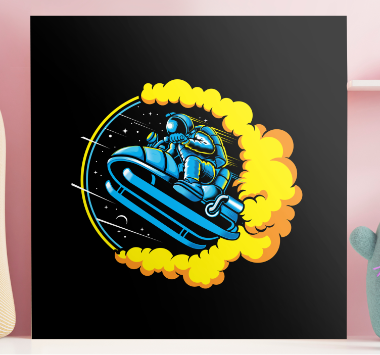 Hvis du ønsker å fornye dekorasjonen av hjemmet ditt på en enkel og stilig måte, har du kommet til rett sted. Dette flotte veggtrykket med et originalt design viser en astronaut som hopper med snøscooter på en elegant svart bakgrunn. Det vil gi en unik og moderne touch til rommets vegger på kun få minutter.