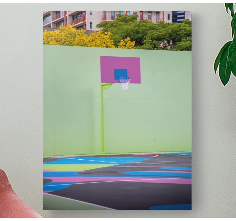 Oppdag et fargerikt basketballbane sport lerretsbilde som bringer liv til ethvert rom! Dette grafiske designet fanger essensen av baskeball, med en imponerende kurv som står i kontrast til den urbane fotograferingen av en domstol. La deg inspirere av energien og bevegelsen som bildet utstråler, perfekt for både sportsentusiaster og kunstelskere!