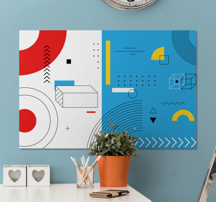 Oppdag skjønnheten i vårt geometriske lerretsbilde med komposisjon av former, der abstrakte design og virvlende former skaper en livlig atmosfære. Dette kunstverket kombinerer geometri, sirkel, triangel, rektangel, piler, prikker og et unikt mønster for å gi et moderne preg til ethvert rom. La deg inspirere av den dynamiske komposisjonen som bringer liv og energi inn i hjemmet ditt!