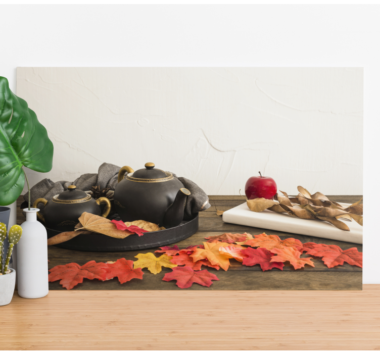 Opplev den magiske skjønnheten av høsten med vårt Høstte-arrangement landskaps lerretsbilde. Dette unike kunstverket kombinerer grafiske elementer som tekanner, borde, blader og stilleben med varme høstfarger som eple og høstløv. Den rustikke stilen gir et koselig preg som vil lyse opp ethvert rom og skape en innbydende atmosfære!