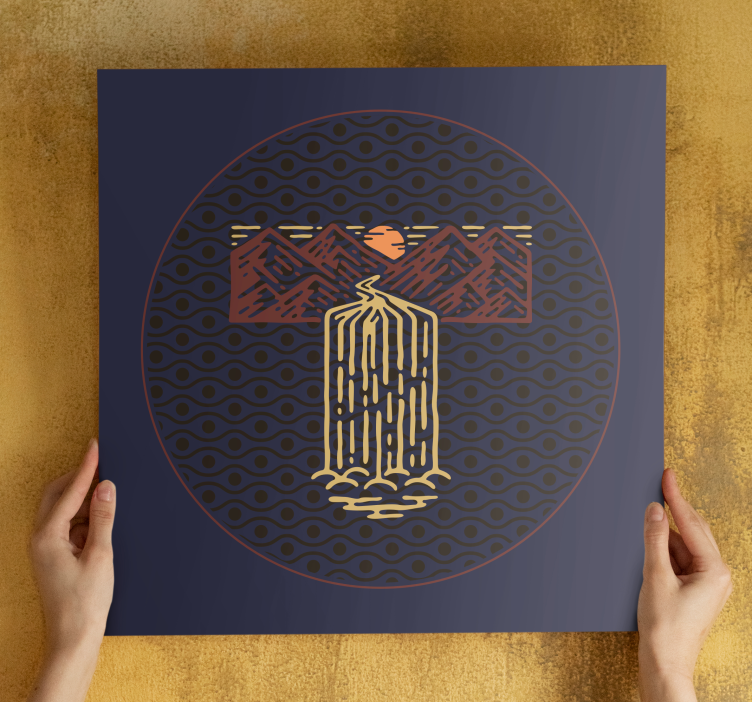 Referanse:: Q7828En beroligende komposisjon med et fossefall som renner ned mellom stiliserte fjelltopper og en nedgående sol. Den sirkulære designen tilfører harmoni, mens de intrikate linjene fremkaller en følelse av ro og forbindelse med naturen.