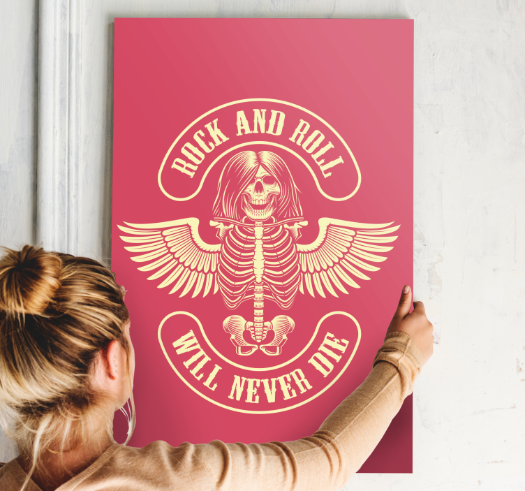 Oppdag det unike lerretsbilde vintage skelett rocklegende designet som fanger essensen av rockemusikk! Dette grafiske mestverket kombinerer et imponerende skjelett med majestetiske vinger og en rockestjernes uforglemmelige tilstedeværelse. Med teksten "aldri dø" og en hodeskalle som symboliserer musikkens evighet, vil dette bildet forvandle ethvert rom til en hyllest til musikkens kraft!
