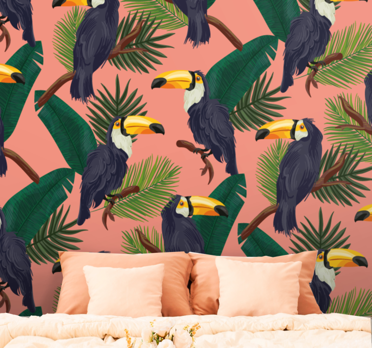 Oppdag det fantastiske fototapet dyr tukaner i tropisk design, hvor fargerike tukaner og frodig løvverk smelter sammen i en grafisk illustrasjon som forvandler ethvert rom. Dette unike mønsteret med livlige fugler og tropiske blader gir en følelse av å være midt i naturens skjønnhet, og skaper en atmosfære av ro og glede!
