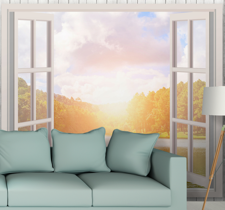 Oppdag en fantastisk måte å forvandle hjemmet ditt på med vårt fototapet natur soloppgang over innsjø. Dette unike designet fanger den magiske skjønnheten av en soloppgang over en glitrende innsjø, omgitt av frodig skog og majestetiske trær. Med et imponerende landskap som gir en illusjon av et vindu til naturen, vil dette trompe l'oeil motivet bringe liv og lys inn i ethvert rom!