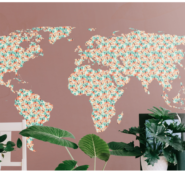 Oppdag det unike fototapetet verdenskart med mønster, hvor grafiske elementer som sommerfugler og verdenskart smelter sammen i en nydelig illustrasjon. Dette designet gir et friskt preg til ethvert rom, og med sitt stilige mønster tar det deg med på en reise rundt i verden!