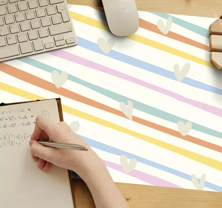 Oppdag vår fargerike hjerter striper musematte tekstur, som kombinerer et grafisk design med lekne pastellfarger og et muntert mønster av hjerter og striper! Den diagonale teksturen gir et unikt preg som gjør skrivebordet ditt både inspirerende og livlig. Perfekt for hjemmekontoret, spillrommet eller som en gave til en venn, denne musematten vil garantert lyse opp hverdagen din!