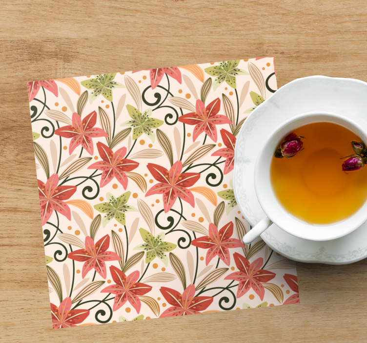 Oppdag det vakre blomstrete mønsteret i dette underlaget! Designet er en grafisk fest av blomster og liljer, med en kunstnerisk illustrasjon som fanger essensen av floral estetikk. De levende fargene gir en moderne stil som er inspirert av naturen, perfekt for å løfte ethvert rom med sin unike sjarm!