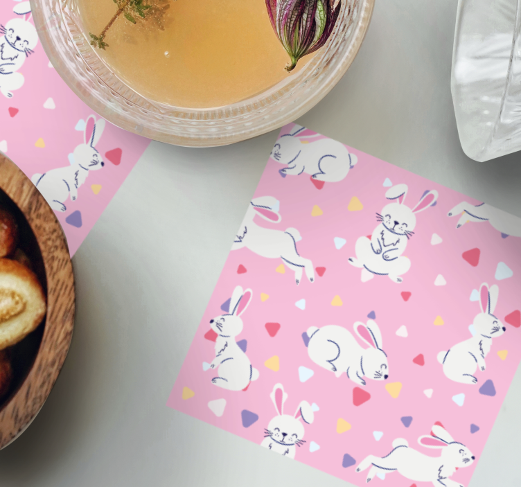 Referanse:: B3565Med sjarmerende kaniner i ulike lekne posisjoner, inkluderer dette designet en livlig blanding av geometriske former mot en myk rosa bakgrunn. Den glade interaksjonen mellom farger og former skaper en fantasifull stemning, noe som gjør det ideelt for friske og livlige temaer.