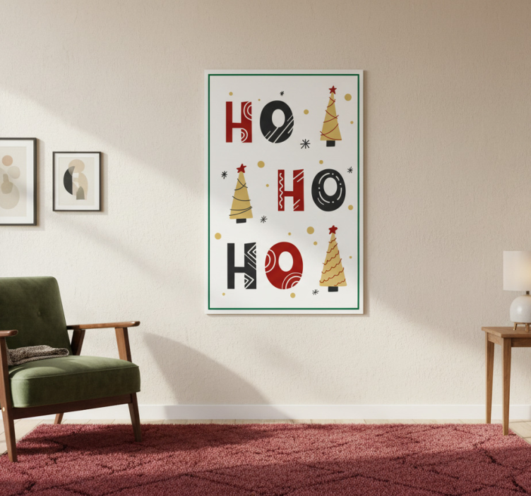 En Juleplakat med ho ho ho juletekstdesign juleplakat er perfekt for å skape en festlig atmosfære i hjemmet ditt. Enten du henger den opp i stuen, gangen eller på barnerommet, vil denne plakaten umiddelbart bringe frem julestemningen. Den inspirerer til glede og samvær, og fungerer som en fantastisk samtalestarter ved juletider. La den bli en del av din juletradisjon, og gled deg over den varme og koselige følelsen den gir!