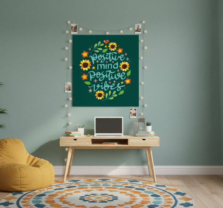Bildet viser et stilfullt arbeidsområde med en beroligende grønn vegg. En dekorativ plakat viser en oppmuntrende melding, omkranset av livlige blomster og blader. Et skrivebord har en bærbar datamaskin, potteplanter og kontorrekvisita, supplert av et fargerikt teppe som forsterker den innbydende atmosfæren. Plakat tenåringer med motiverende sitat i vakre farger er en fantastisk måte å lyse opp ethvert rom! Med sitt grafiske design som inkluderer en satengfinish, gir denne plakaten en utmerket fargeintensitet som virkelig fanger øyet. Den er laget av høykvalitetsmaterialer, noe som gjør den både motstandsdyktig og vaskbar. Du trenger ikke å bekymre deg for gjenskinn fra lys, da den spesielle finishen lar deg nyte de vakre fargene uten distraksjoner. Plakaten er enkel å installere og kan tilpasses etter dine ønsker, noe som gir deg friheten til å skape et unikt uttrykk i tenåringens rom.