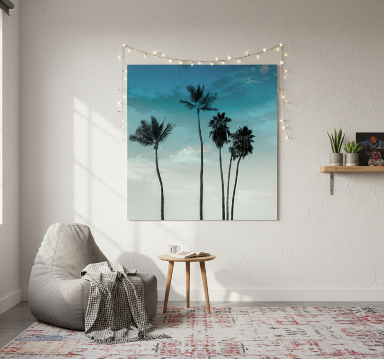 En plakate stue med design av fem lange palmer plakate stue er mer enn bare en dekorasjon; det er en invitasjon til å skape en oase av ro og skjønnhet i hjemmet ditt. Med sine livlige farger og tropiske tema, tilfører denne plakaten en følelse av ferie og avslapning til ethvert rom. Perfekt for stuen, soverommet eller til og med kontoret, vil denne plakaten inspirere til kreativitet og glede! La den transformere ditt interiør og gi liv til veggene!