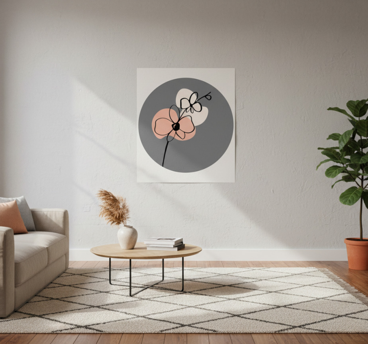 Bildet viser et moderne interiør med et minimalistisk design i myke, nøytrale farger. Et sirkulært veggkunstverk viser abstrakte blomsterelementer mot en grå bakgrunn. I forgrunnen kompletterer et kaffebord de koselige sitteplassene, mens en plante tilfører et friskt preg og forbedrer den innbydende atmosfæren. Planteplakat med abstrakt linjekunst av orkideer er et unikt kunstverk som kombinerer grafisk design med naturens skjønnhet. Denne plakaten fremhever de delikate linjene og formene av orkideer, noe som gir en moderne og stilren atmosfære til ethvert rom. Med en satengfinish som forhindrer refleksjoner fra lys, sørger den for at fargene står i fokus og gir et vakkert inntrykk. Plakaten er også enkel å rengjøre med en fuktig klut, noe som gjør den praktisk for daglig bruk.