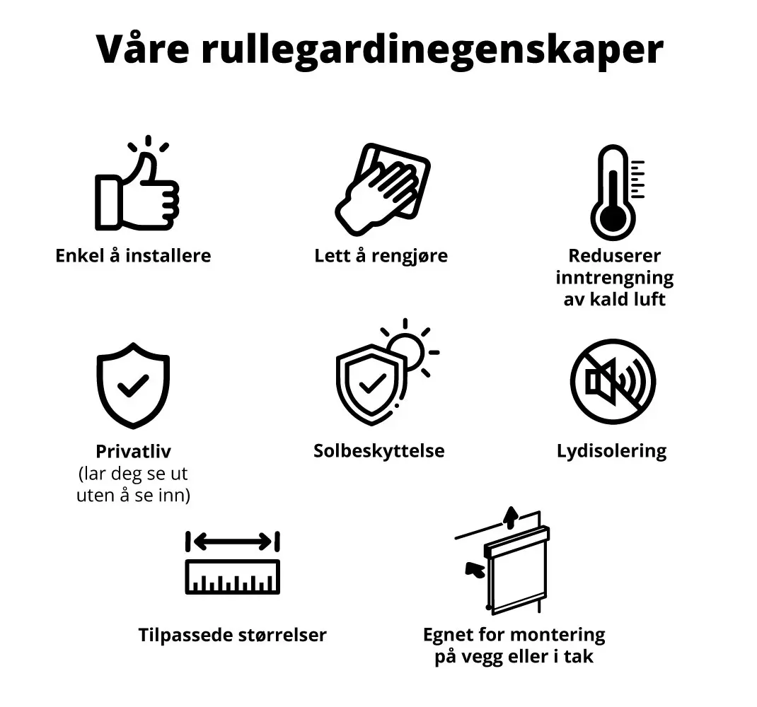 Egen tilpassede rullegardiner er et moderne og billig alternativ for å dekorere ethvert vindu. Installasjonen og monteringen av Tensticker rullegardiner er veldig enkel, du kan gjøre det selv uten å investere for mye krefter og tid. Vær oppmerksom på at våre rullegardiner er ferdig montert og bare krever montering av brakettene.