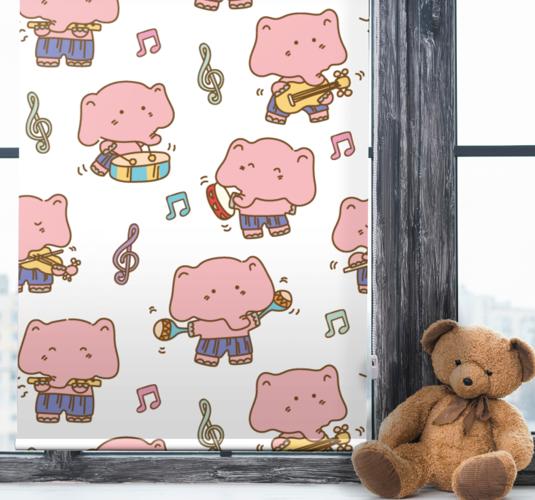 . Få dette designet og nyt alle de unike elementene du kan bruke til å endre utseendet på vinduene dine når som helst. Dette er mer enn bare en enkel dekorasjon. Dette produktet er laget med de beste materialene som finnes på markedet og din tilfredshet i tankene. Du kan når som helst kontrollere mengden lys som kommer inn i huset ditt. Dette er flott hvis du er fan av tegneseriemusikalske mønstre i vinduene dine.Rosa musikalsk elefantmønster rullegardin