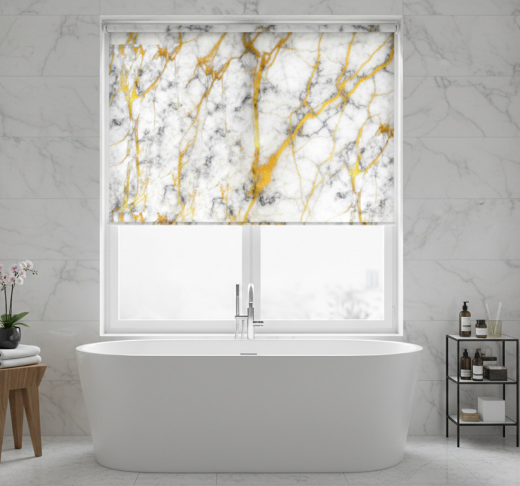 Rullegardin bad i elegant grå og gullmarmor