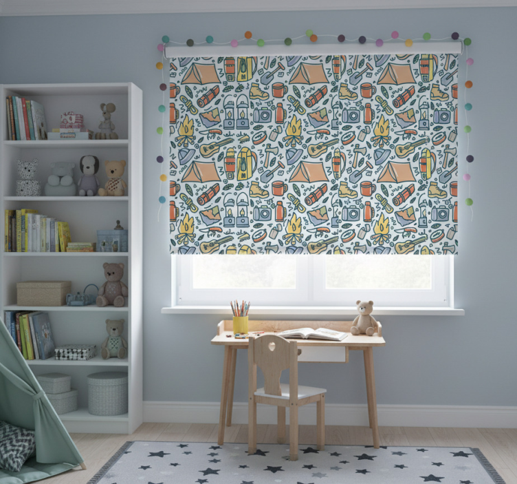 Rullegardin barn håndtegnede fjell og campingutstyr
