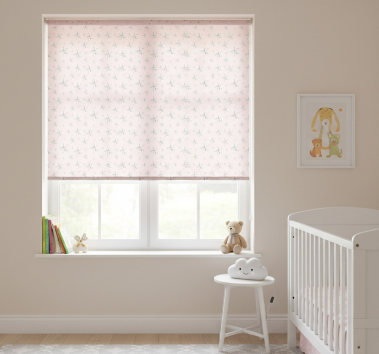 Rullegardin barn hvite stjerner rosa bakgrunn