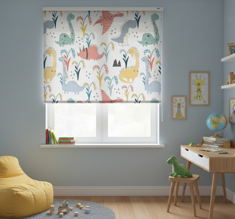 Referanse:: E6903Oppdag den fantastiske rullegardinen barn dinosaurer og trær, designet med et lekent og fargerikt grafisk motiv som fanger barnas fantasi! Denne rullegardinen er dekorert med søte dinosaurer og grønne trær, og skaper en spennende atmosfære på barnerommet. Den er ikke bare en praktisk løsning for å regulere lys og privatliv, men også en morsom del av innredningen som vil glede både store og små!