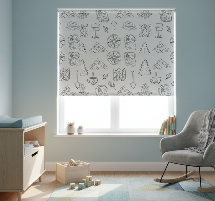 Rullegardin barn med håndtegnet kompass og fjellmotiv