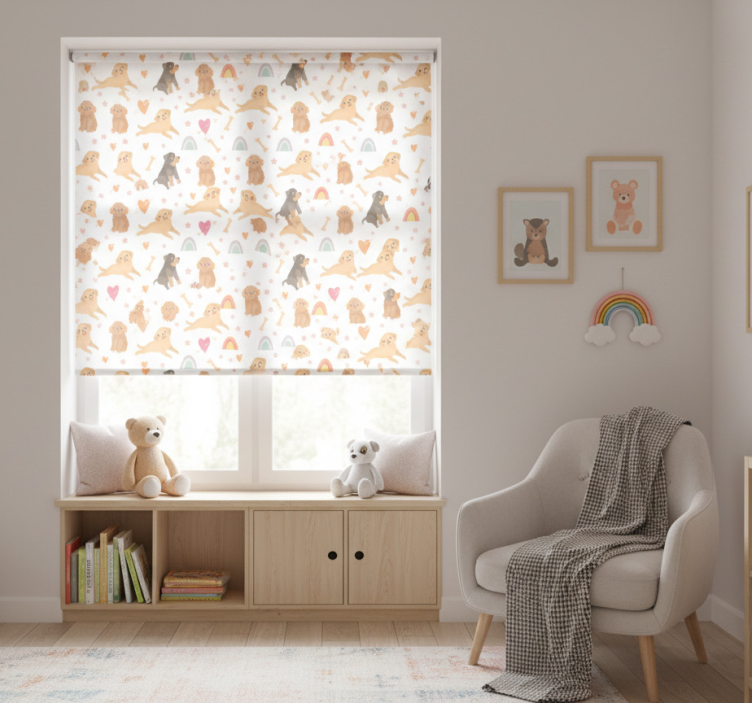 Den rullegardin barn søte hunder og regnbue mønster rullegardin barn er perfekt for å skape en koselig og inspirerende atmosfære i barnerommet. Med sitt fargerike design kan denne rullegardinen forvandle ethvert rom til et magisk sted der fantasien blomstrer! Den er ikke bare vakker, men gir også nødvendig beskyttelse mot direkte sollys og sikrer personvern når den senkes. La barnet ditt nyte et rom som er både trygt og stilfullt!