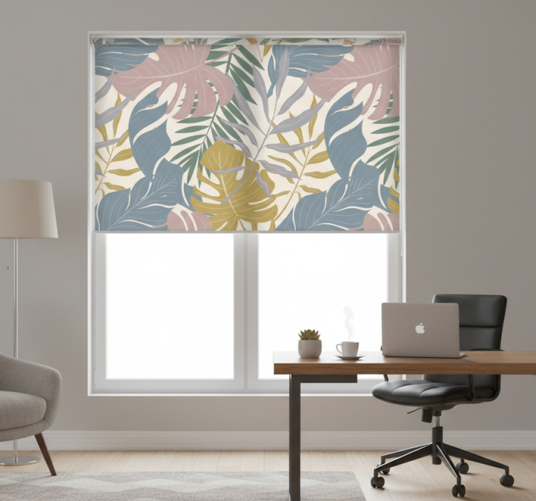 En Rullegardin hjemmekontor tropiske plante detaljer rullegardin hjemmekontor er perfekt for å skape en inspirerende atmosfære i hjemmet. Den tilfører et snev av natur og liv til rommet, noe som kan øke produktiviteten og kreativiteten. Med sitt stilige design passer den perfekt inn i enhver innredning og gir en følelse av ro og harmoni i arbeidsområdet. La den tropiske stilen ta deg med på en reise til eksotiske strender, samtidig som du får et funksjonelt produkt som beskytter mot for mye lys og gir deg ønsket personvern!