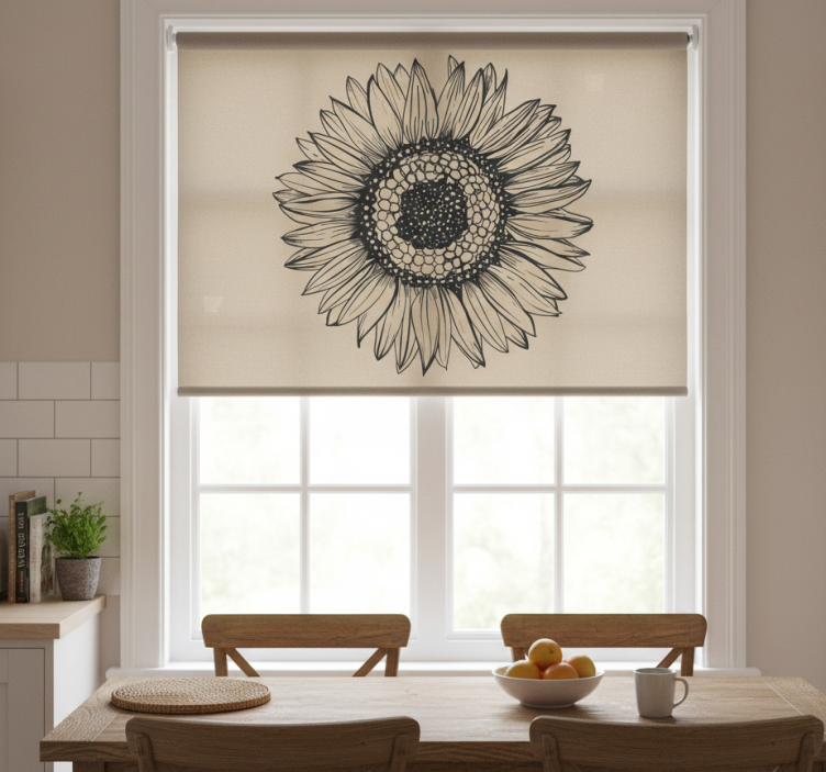 En Rullegardin kjøkken beige solblomst rullegardin kjøkken tilfører en unik sjarm til ethvert rom. Den delikate balansen mellom farge og mønster gjør den til en perfekt dekorativ løsning. Med sin evne til å filtrere sollys, gir den en varm og innbydende atmosfære. Denne rullegardinen skaper også et behagelig personvern, noe som gjør den ideell for både kjøkken og stuer. La deg inspirere av den naturlige skjønnheten og gjør hjemmet ditt til et sted med stil og komfort!