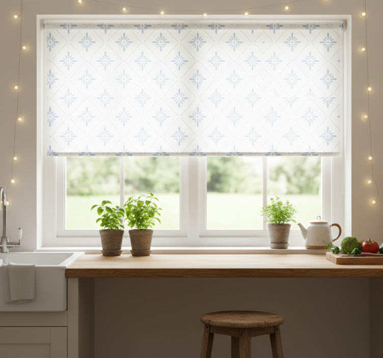 Rullegardin kjøkken blå rhombusfliser rullegardin kjøkken er ikke bare en praktisk løsning for å regulere lys og privatliv, men også en strålende dekorativ detalj som løfter rommet. Den vakre blåfargen og de grafiske mønstrene skaper en harmonisk atmosfære, perfekt for både avslapning og matlaging. Med dette rullegardinet kan du enkelt forvandle kjøkkenet ditt til et stilfullt rom hvor du kan trives!
