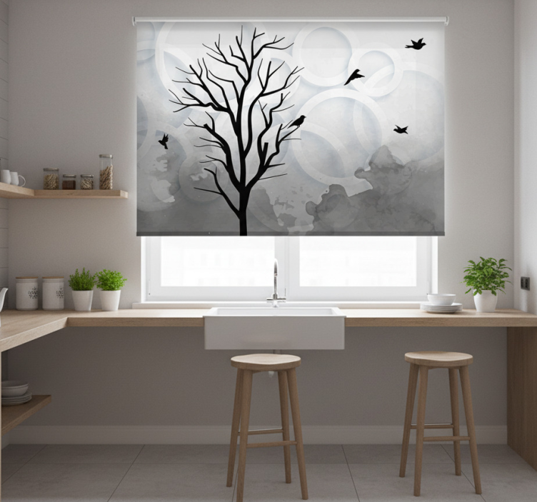 Installasjonen av vår rullegardin er enkel og effektiv. Du trenger bare to klikk for å feste den på plass, og du kan enkelt ta den ned for rengjøring når som helst. Rullegardin kjøkken kunstnerisk svart tre med fugler rullegardin kjøkken er designet for å passe perfekt i ditt hjem!