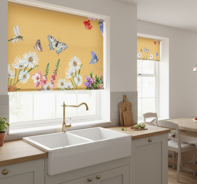 Rullegardin kjøkken maleri med tusenfryd og sommerfugler