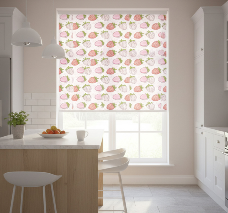 Rullegardin kjøkken med jordbærmønster