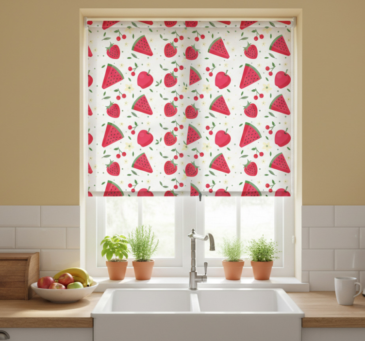 Rullegardin kjøkken med mønster av forskjellige frukter