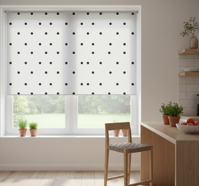 Rullegardin kjøkken nordisk stil svarte prikker rullegardin kjøkken er den perfekte løsningen for å heve interiøret i ditt hjem! Med sitt moderne design og enkle, stilige uttrykk, kan denne rullegardinen transformere ethvert kjøkken til en koselig og innbydende plass. Den beskytter mot sollys og gir deg muligheten til å regulere romtemperaturen, samtidig som den lar deg nyte privatliv uten å ofre lyset. La kreativiteten blomstre med denne dekorative løsningen!