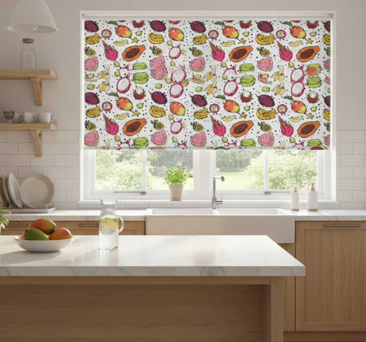 En Rullegardin kjøkken skisse av fargerike eksotiske frukter rullegardin kjøkken er mer enn bare en praktisk løsning for solbeskyttelse; den fungerer også som et kunstverk som kan forvandle rommet. Denne rullegardinen tilfører en livlig fargepalett og en eksotisk følelse, noe som gjør at den skiller seg ut som en fantastisk dekorasjon. Det er en perfekt måte å uttrykke din personlige stil på, samtidig som den gir et friskt pust til kjøkkenet!