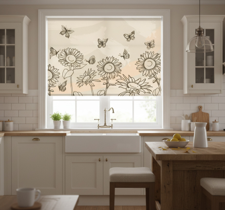 En rullegardin kjøkken solblomster og sommerfugler beige rullegardin kjøkken tilfører et lekent og livlig preg til ditt kjøkken. Den lyse og glade designen skaper en innbydende atmosfære, perfekt for både hverdag og fest. Gardinen lyser opp rommet og gir en følelse av å være ute i naturen. Det er en utmerket måte å forbedre interiøret på uten å måtte gjøre store endringer. Med sin unike stil skiller denne rullegardinen seg ut og gir kjøkkenet ditt et friskt og moderne utseende!