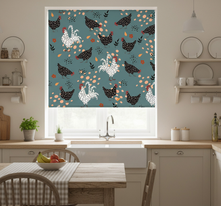 Rullegardin kjøkken svart-hvite høner med blomster