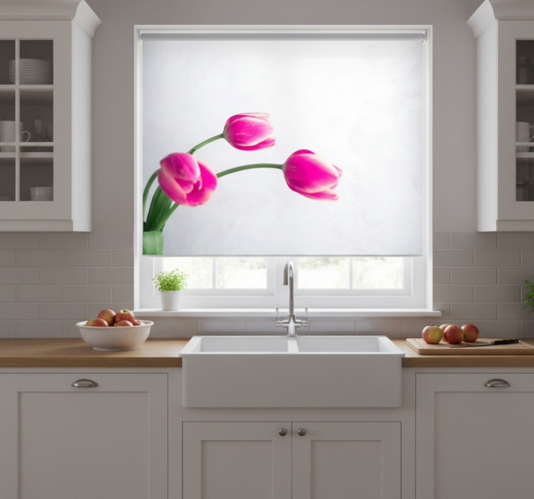 Rullegardin kjøkken tre tulipaner hvit bakgrunn