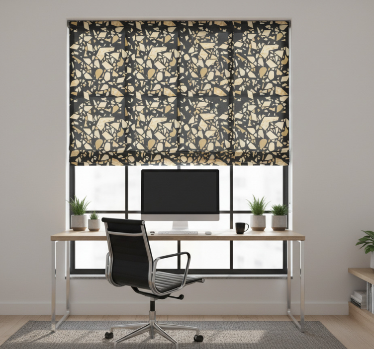 Et rullegardin kontor terrazzo stil svart gull rullegardin kontor tilfører en sofistikert touch til enhver kontorinnredning. Med sitt unike design kan dette produktet være med på å skape en inspirerende atmosfære, hvor både kreativitet og produktivitet blomstrer! Det moderne utseendet gjør at det enkelt kan kombineres med ulike farger og stiler, og det vil garantert bli et samtaleemne blant dine kolleger. Gjør kontoret ditt til et stilfullt og behagelig sted å arbeide!