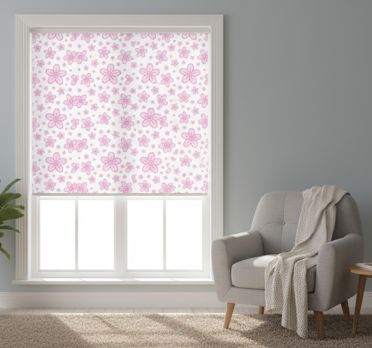 Rullegardin moderne søte små rosa blomster på hvit bakgrunn