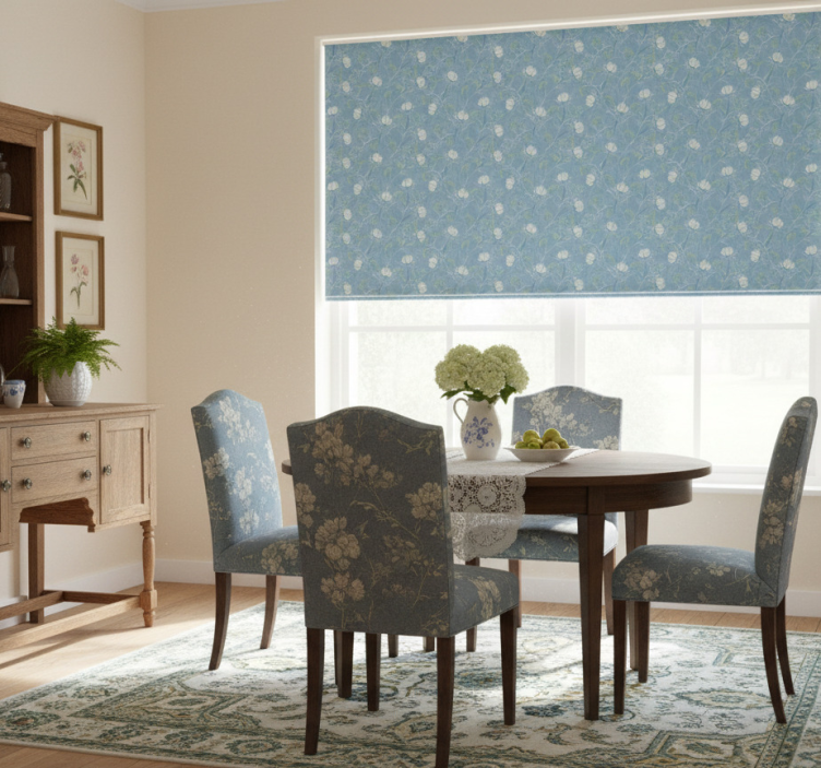 Rullegardin spisestue blå vintage grandmillenial mønster