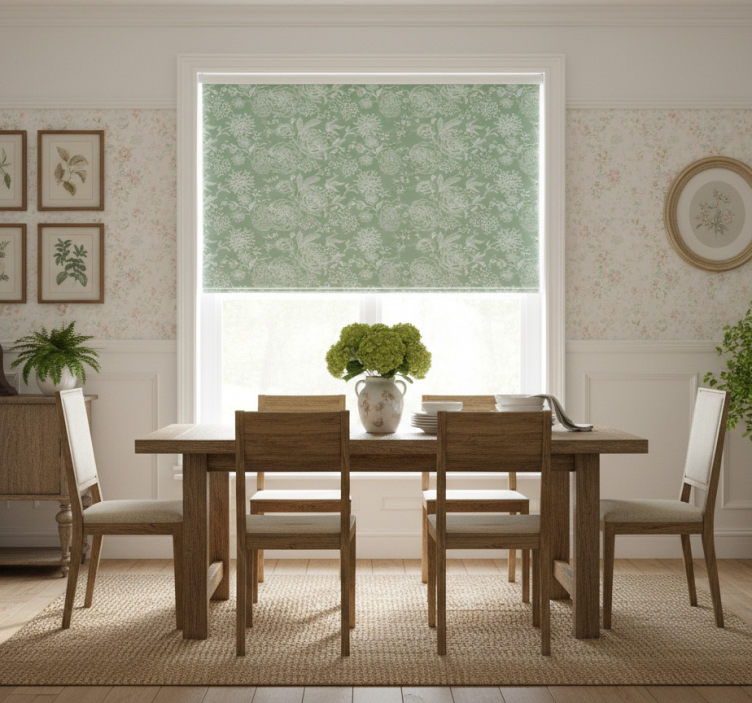 Rullegardin spisestue grønn blomster grandmillenial stil