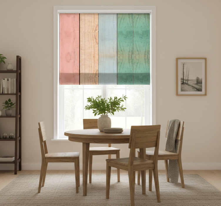 En Rullegardin spisestue i fargerike treplanker er ikke bare en funksjonell løsning, men også et vakkert dekorativt element! Den tilfører liv og farge til rommet, og skaper en innbydende atmosfære for både familie og gjester. Den unike kombinasjonen av treplanker og farger gjør at den skiller seg ut som et stilfullt valg for din spisestue. La denne rullegardinen bli midtpunktet i rommet og opplev hvordan den forvandler ditt interiør til noe ekstraordinært!