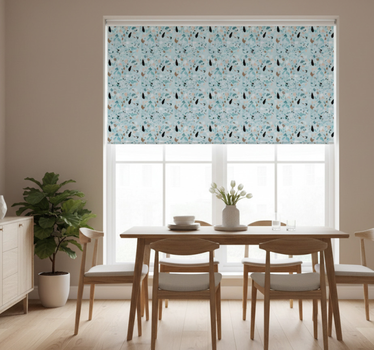 Rullegardin spisestue lyseblå terrazzoeffekt