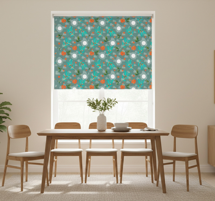 Rullegardin spisestue med blomstergeometri