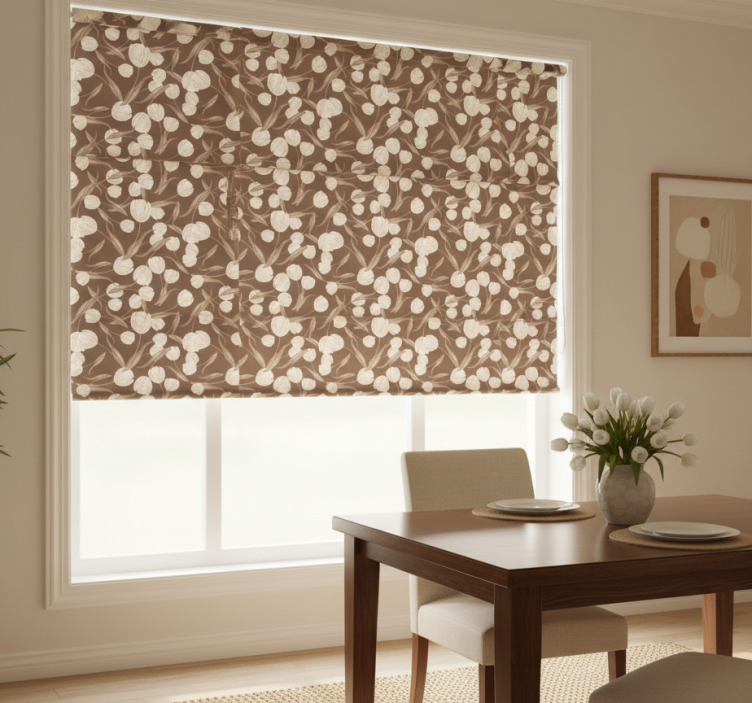 Rullegardin spisestue med elegant beige tulipanmønster