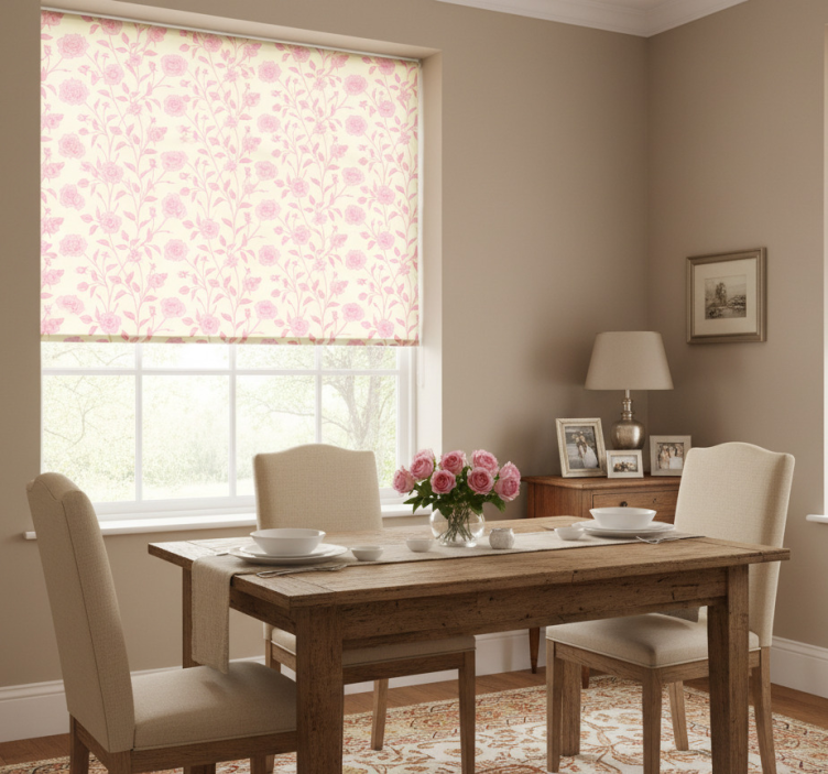 Rullegardin spisestue med vintage små roser på rosa bakgrunn