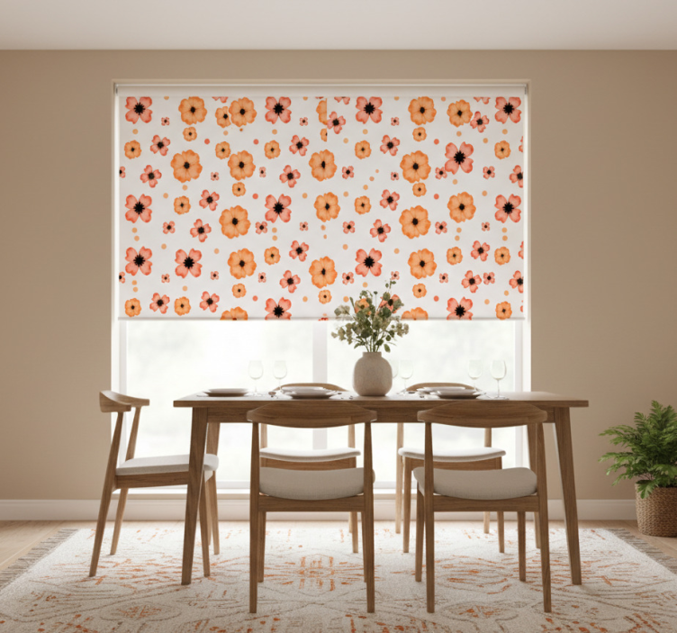 Rullegardin spisestue oransje og rosa akvarellmønster