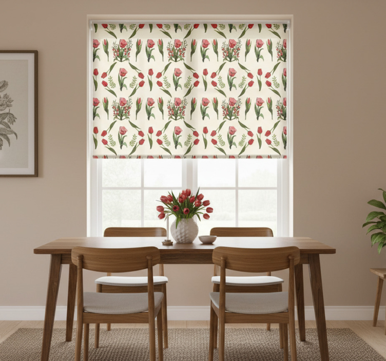 Informasjon Rullegardin spisestue vår med røde tulipaner
