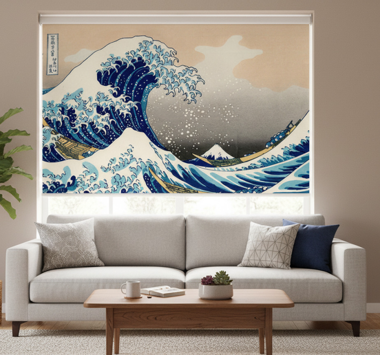 En Rullegardin stue hokusai bølgen fototapet rullegardin stue er mer enn bare en gardin; den er et kunstverk som forvandler stuen din til et unikt rom. Med sitt imponerende design og stilige utseende kan denne rullegardinen bli det naturlige midtpunktet i ethvert rom. Den tilfører karakter og sjarm, og gir en følelse av ro og eleganse. La deg inspirere av Hokusais bølger, som skaper en harmonisk atmosfære i hjemmet ditt!