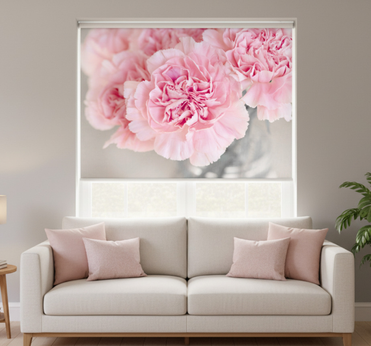 Rullegardin stue mange rosa nelliker grå bakgrunn