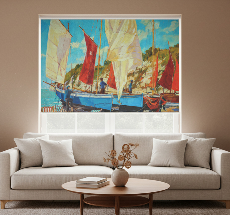 Referanse:: E8593Oppdag det unike designet på vår Rullegardin stue tre båter på vannet! Med et inspirerende grafisk mønster av tre båter som seiler på vannet, tilfører denne rullegardinen en beroligende atmosfære til enhver stue. Den kombinerer stil og funksjonalitet, og er både enkel å rengjøre og montere med bare 2 klikk. Denne rullegardinen gir ikke bare beskyttelse mot direkte sollys, men gir også muligheten til å regulere romtemperaturen, samt skaper et privat rom når den senkes.